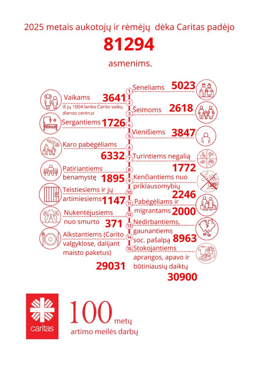 Vargas keičia veidus, tačiau karitiečiai, kaip prieš 100 metų, taip ir šiandien, stengiasi padėti, nepriklausomai nuo žmonių tautybės, amžiaus, religijos, lyties, statuso ir kitų skirtumų. Vien per praėjusius metus aukotojų ir rėmėjų dėka Caritas padėjo 81294 asmenims. Dėkojame visiems, kurių prisidėjimu – savanoryste, malda, auka, skirdami 1,2 proc. – galime vienas kitam būti Caritas.
