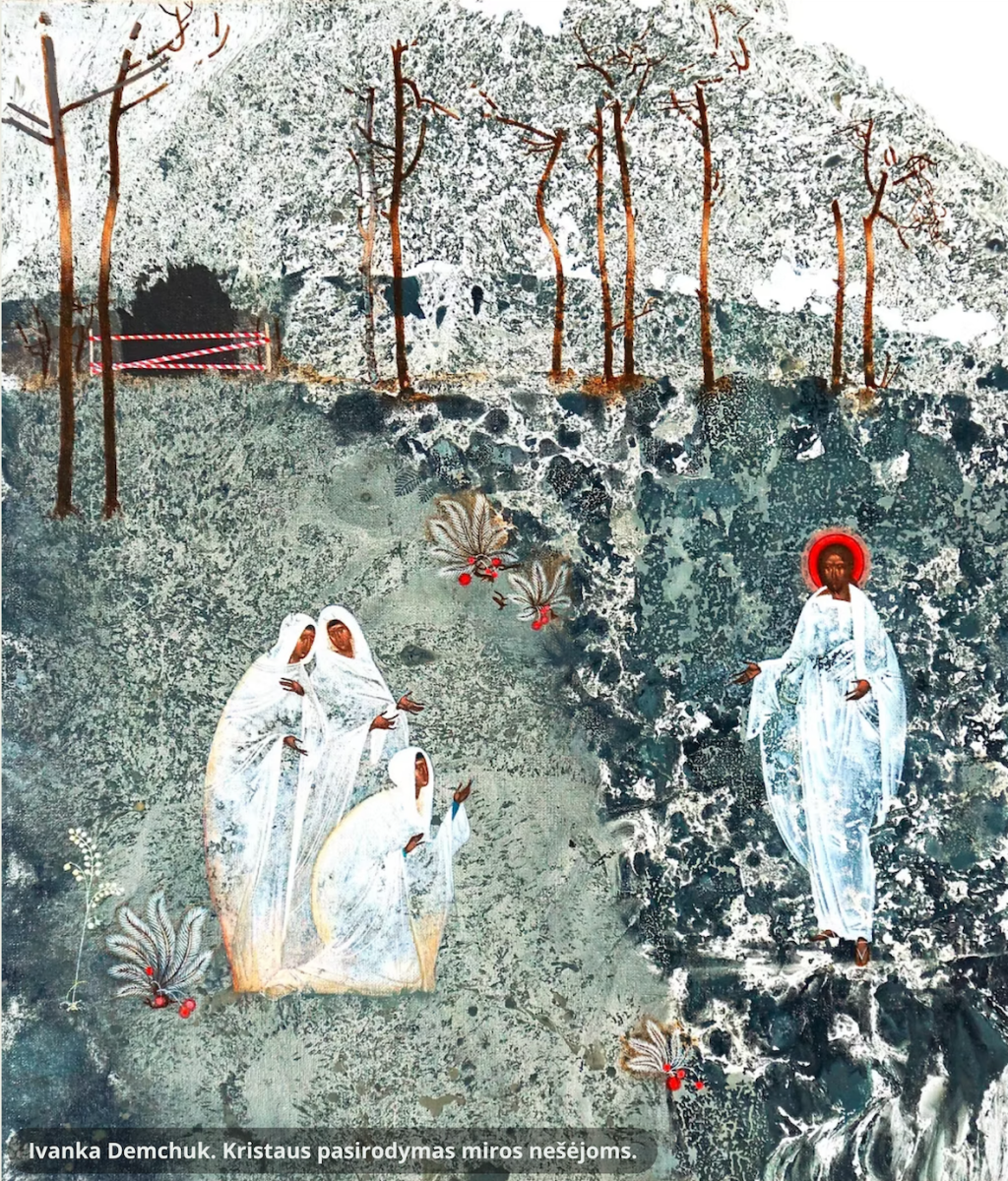 Kai moterys, atėjusios prie kapo, išssigando neradusios Jėzaus, kuris buvo ten palaidotas, du vyrai, spindinčiais drabužiais pasakė: "Nėra jo čia, jis prisikėlė" (Lk 24,6a).