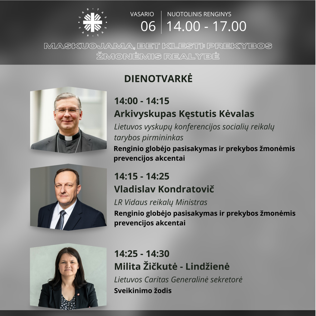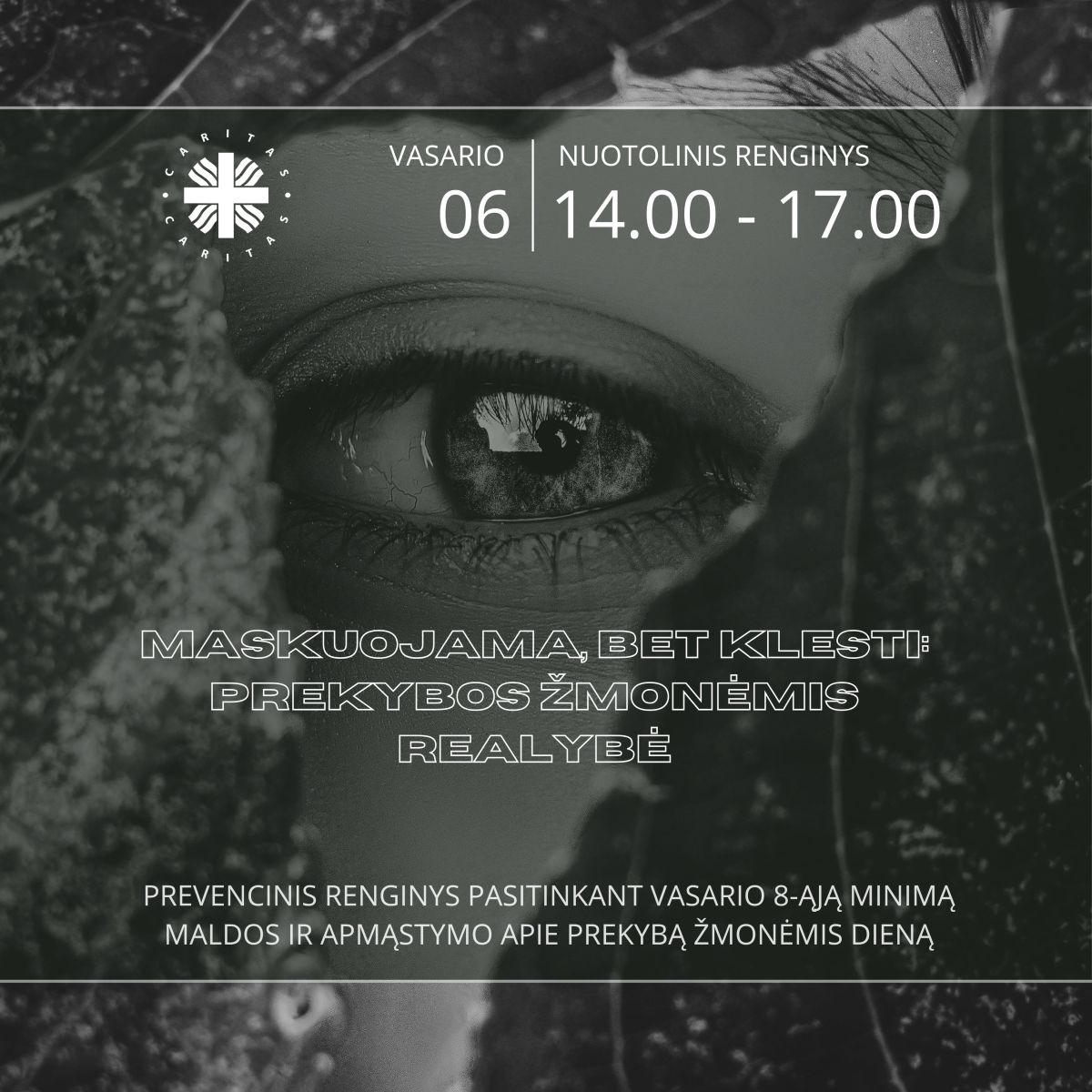Pasitinkant vasario 8-ąją visame pasaulyje minimą Maldos ir apmąstymo apie prekybą žmonėmis dieną, vasario 6-ąją nuo 14 val. Lietuvos Caritas kviečia į visiems atvirą nuotolinį renginį „Maskuojama, bet klesti: prekybos žmonėmis realybė”, kuriame bus aptariamos naujausios prekybos žmonėmis tendencijos, pristatomas nukentėjusio asmens portretas, pateikiami statistiniai duomenys ir kitos aktualijos.